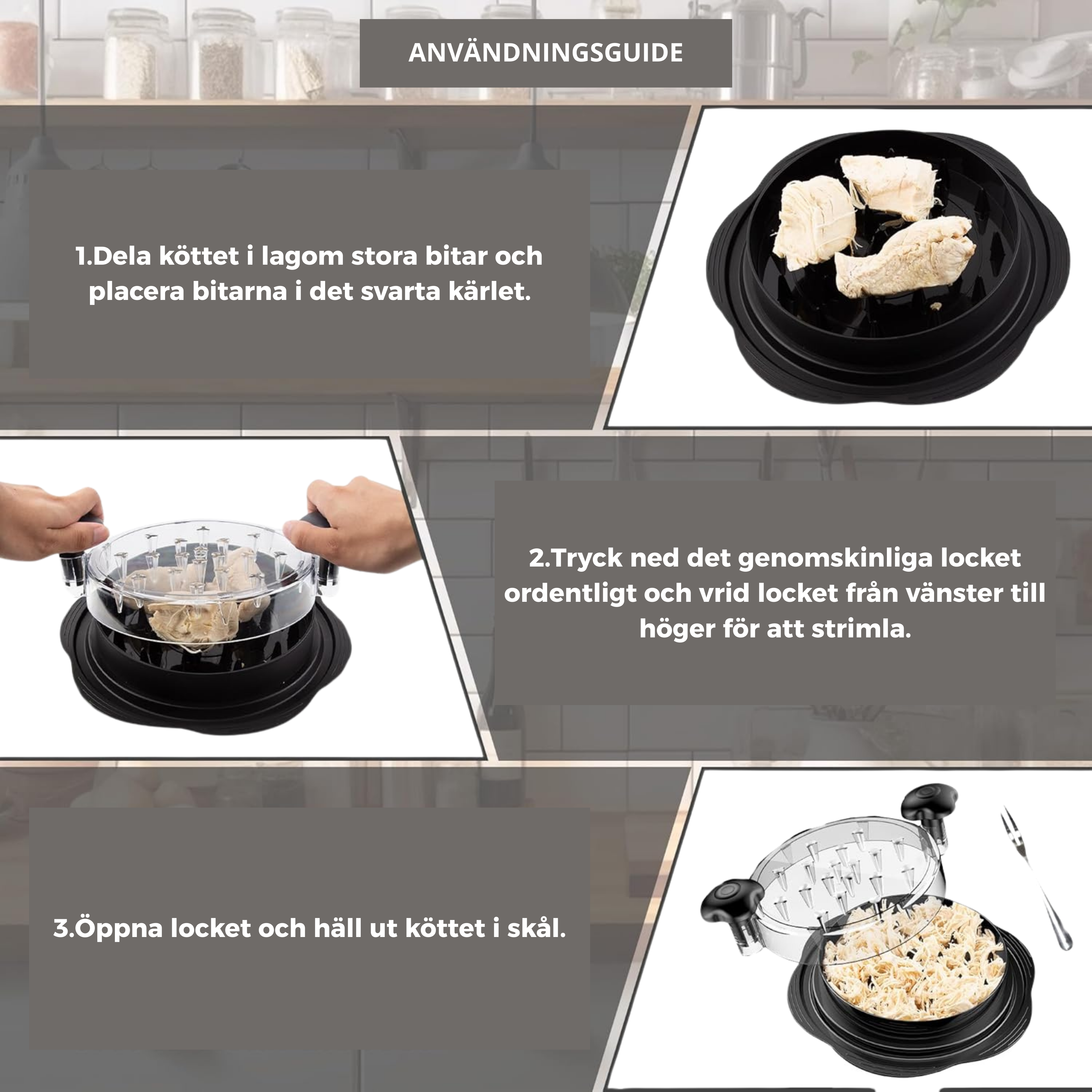 Shredda kräver ingen elektricitet – den är säker och enkel att använda. Lägg bara köttet i behållaren, stäng locket, håll i handtagen med båda händerna och vrid några varv för att snabbt och enkelt strimla köttet.