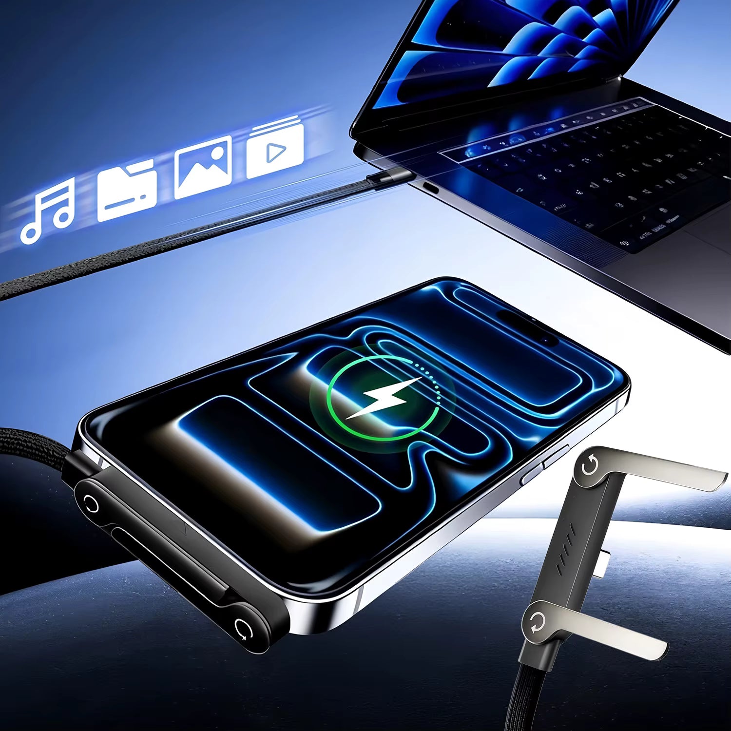 En smart lösning för ett mer organiserat liv. Den här 2-i-1-kabeln kombinerar kraftfull laddning, hopfällbart stativ och trasselfri design i en 1,5 meter lång kabel. Perfekt för skrivbordet, nattduksbordet eller resväskan.